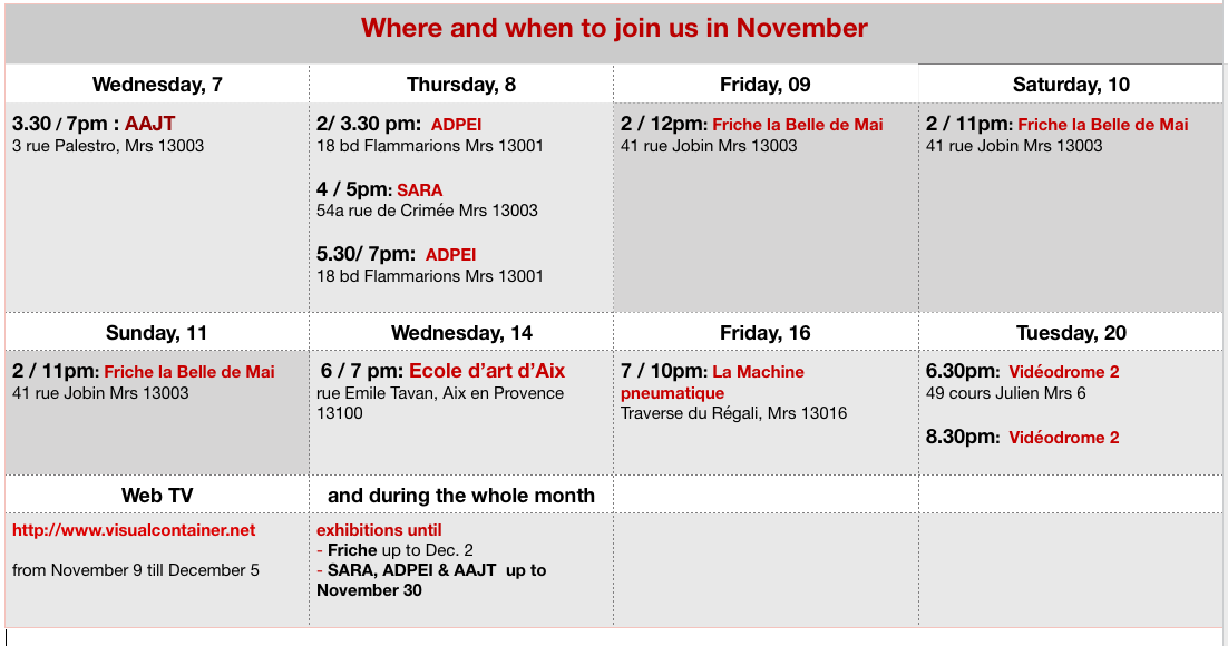 Aix-en-Provence (Art school) Wednesday, November 14 6pm. Screening program & discussion