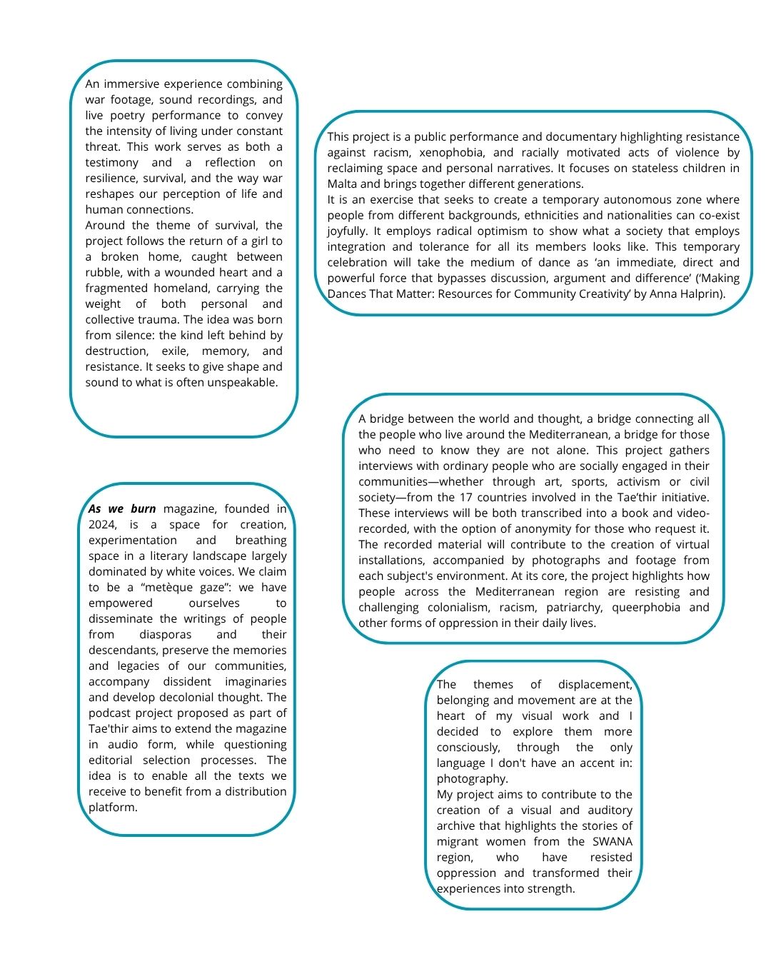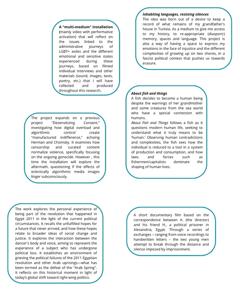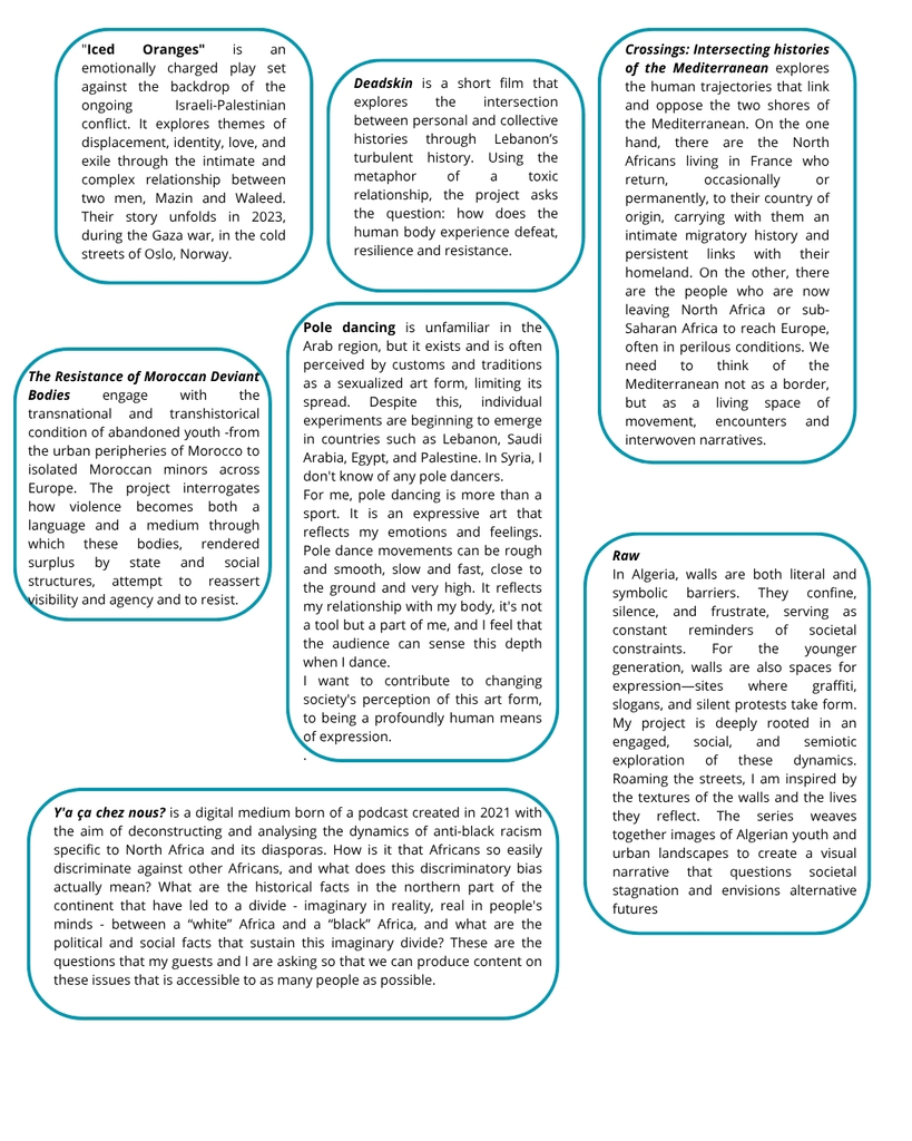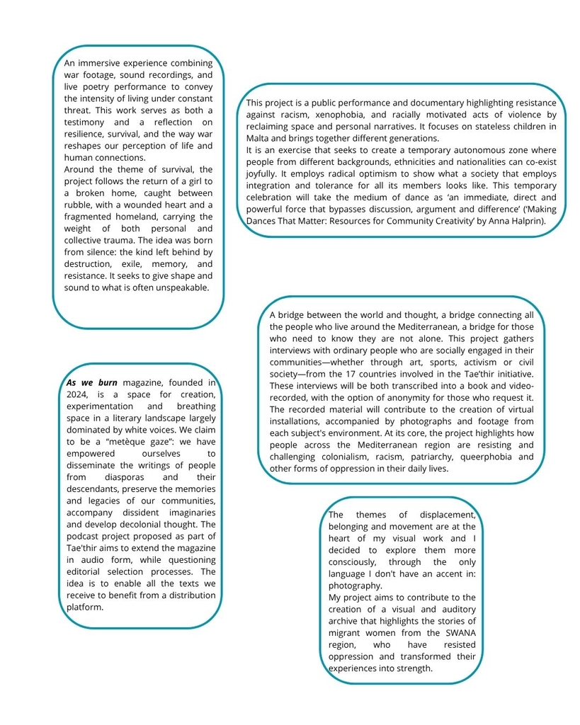 From Algeria, Egypt, France, Greece, Italy, Jordan, Lebanon, Malta, Morocco, Syria and Tunisia, 22 participants in the second session of the Tae’thir project tell us how they see the world, through the prism of their artistic projects. They explore concepts such as migration, identity, discrimination, queer, censorship, social mobilisation, colonialism, collective memory, destruction, resistance and the Mediterranean.