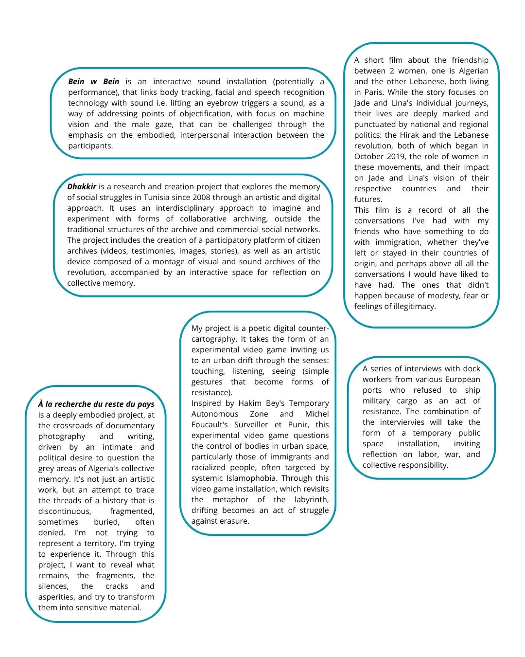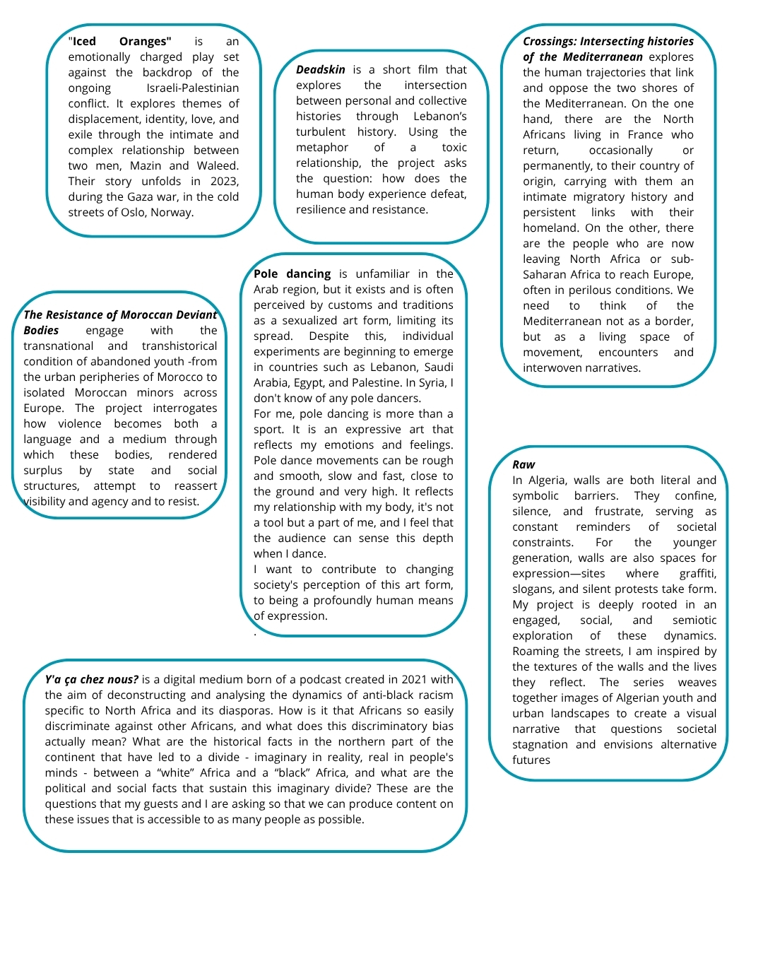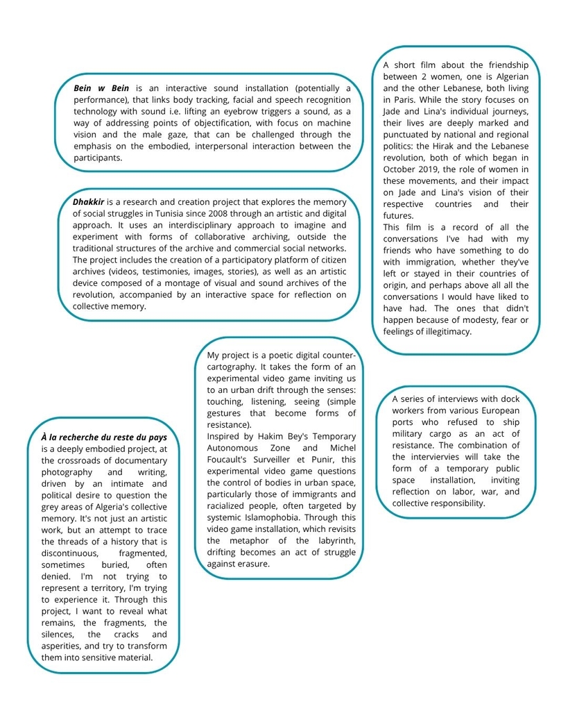 From Algeria, Egypt, France, Greece, Italy, Jordan, Lebanon, Malta, Morocco, Syria and Tunisia, 22 participants in the second session of the Tae’thir project tell us how they see the world, through the prism of their artistic projects. They explore concepts such as migration, identity, discrimination, queer, censorship, social mobilisation, colonialism, collective memory, destruction, resistance and the Mediterranean.