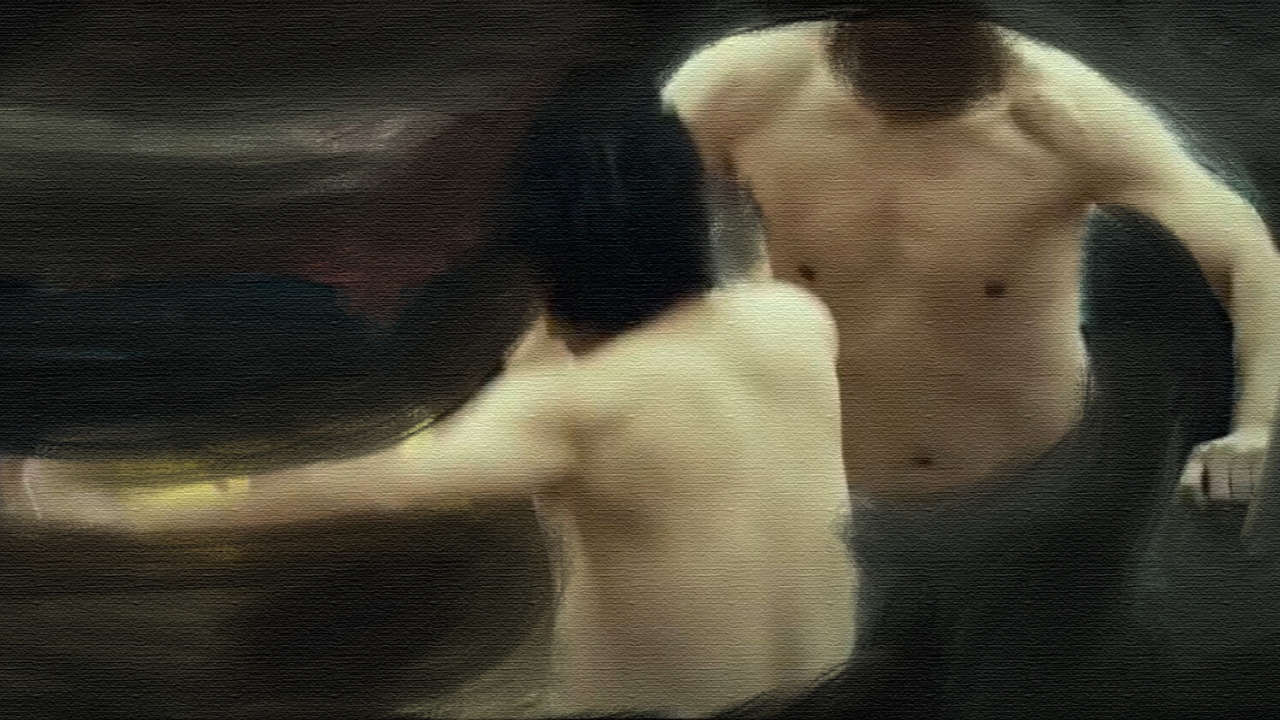 chaque geste et chaque signe. La peinture devient vivante. De plus la musique sublime la scène et donne d’autres significations et suggestions. Une succession de sentiments et d’humeurs évolue vers une situation qui immortalise chaque changement et indécision dans l’équilibre entre passé et futur.
